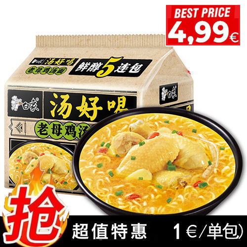 Nudel: Weizenmehl, Palmöl, Tapiokastärke, Verdickungsmittel E1420 E401 E412, Glutenpulver, Salz, Stabilisatoren E452 E451, Emulgatoren E471, Säureregulatoren E500, Antioxidansmittel E319. Suppenpackung: Palmöl, Salz, Ingwer, Karottenpulver, Zwiebel, Aroma, Sesamöl, Mononatriumglutamat, Zucker, Hefeextrakt, Pilzpulver, hydrolysiertes pflanzliches Proteinpulver, Maltodextrin, Geschmacksverstärker E635, Zimtpulver, chinesisches Aschenpulver, Verdickungsmittel E412, Farbstoff E100ii. Gemüsepackung: getrockneter Kohl, Karotte, Schalotte.